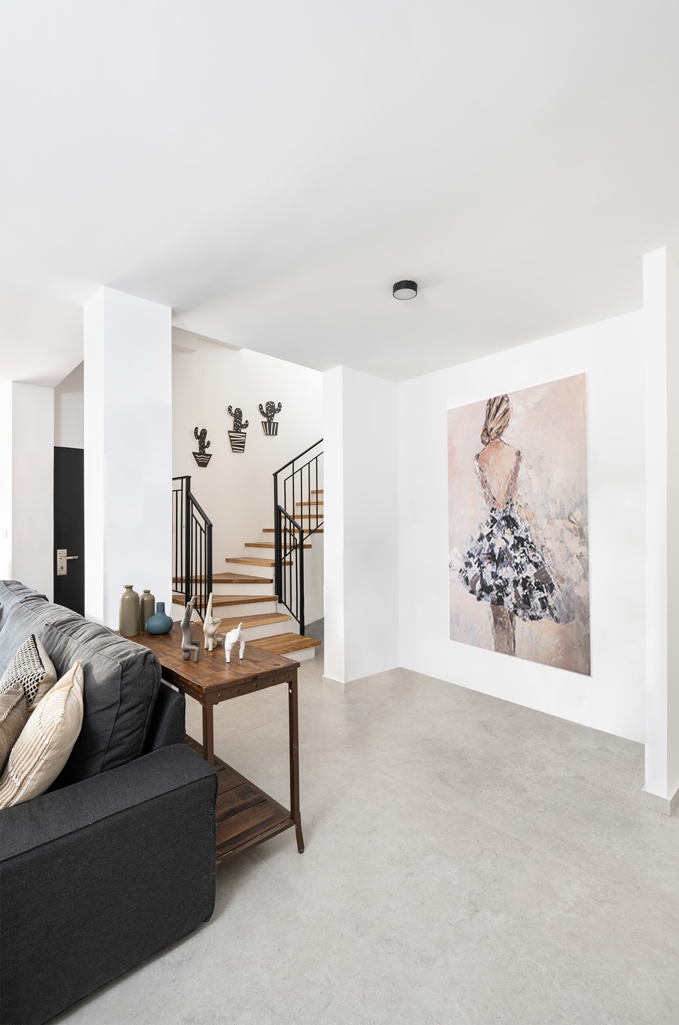 הבית הזה בכפר יונה שופץ מן היסוד. החלפנו את כל תשתיות החשמל והאינסטלציה, החלונות, הדלתות והריצוף. שברנו קירות, תקרה ותכננו מחדש את גרם המדרגות. המטבח הוחלף, אזור הכניסה לבית נהרס ותוכנן מחדש וגם הגינה שודרגה.